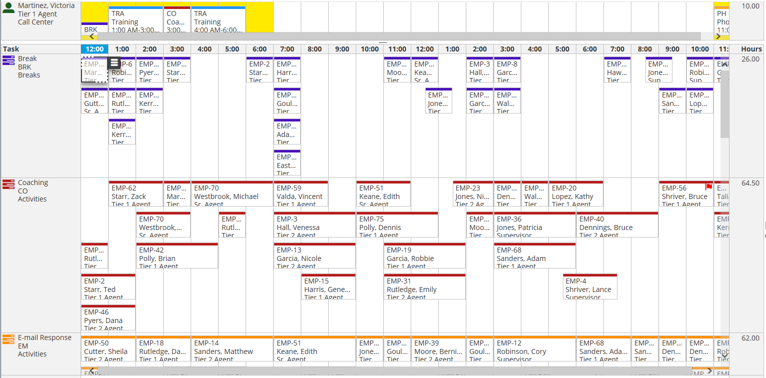 The time blocks of the Task View by Task are listed in the topmost row. Since the start and end times for individual employee task assignments may be different than the shift start and end times, the overall time window starts with the earliest task assignment start time and ends with the latest task assignment end time so that all employee task assignments will be visible.