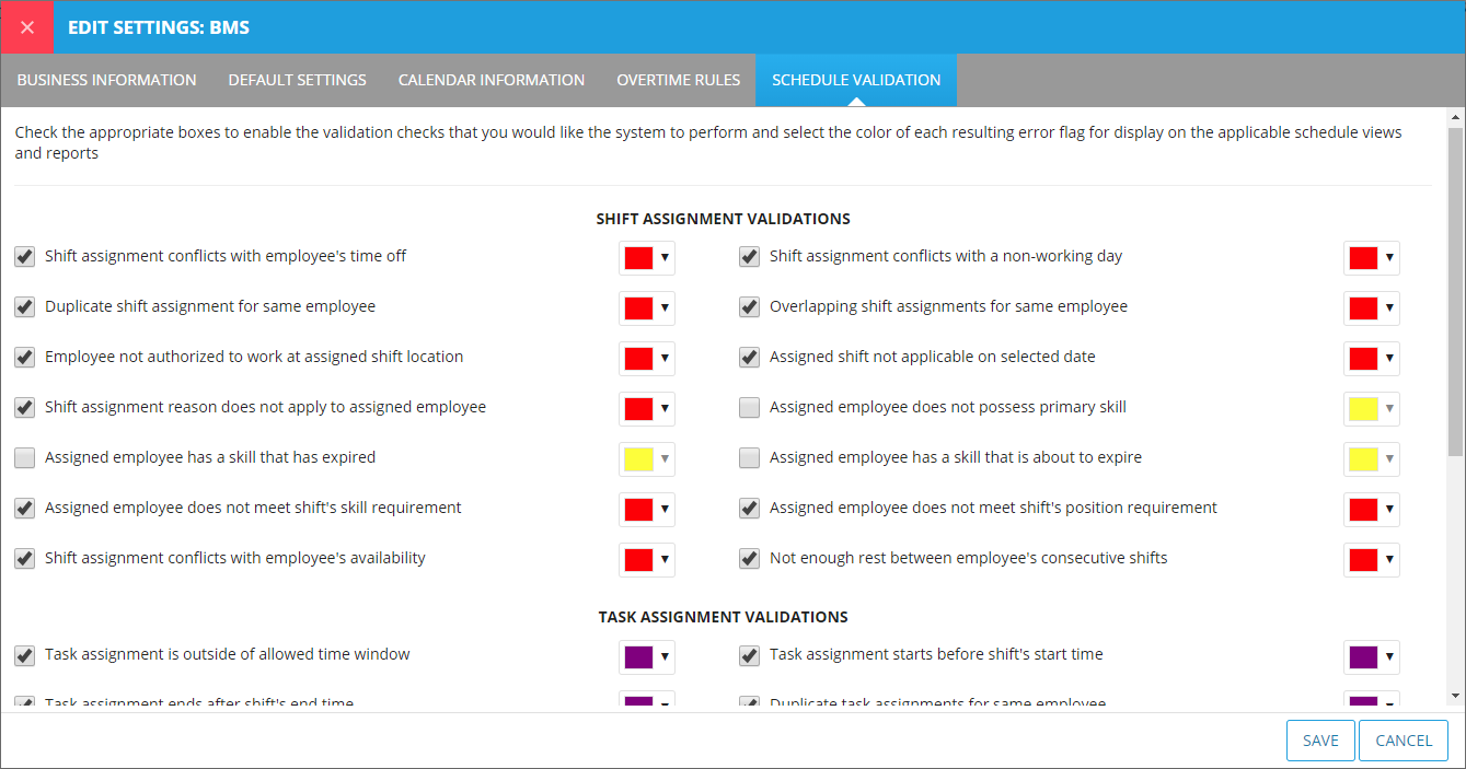 Validation checks are grouped under three categories as described below. Check the applicable boxes in each tab to enable the validation checks you would like the system to perform and select the color of each resulting error flag for display on the applicable schedule views and reports.