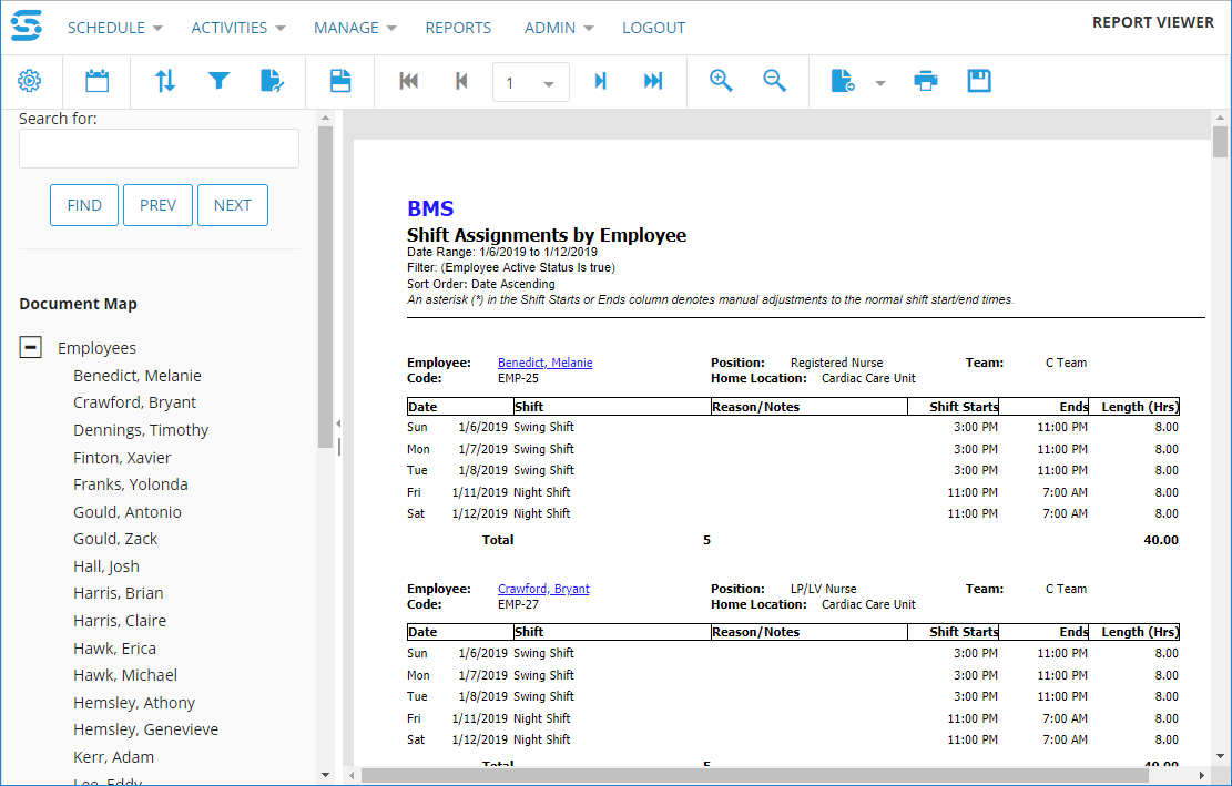 The document map simplifies navigation around the report. Not every report includes a document map, but the reports that do have one are organized by employee, location, date, or task. In the document map, you can: